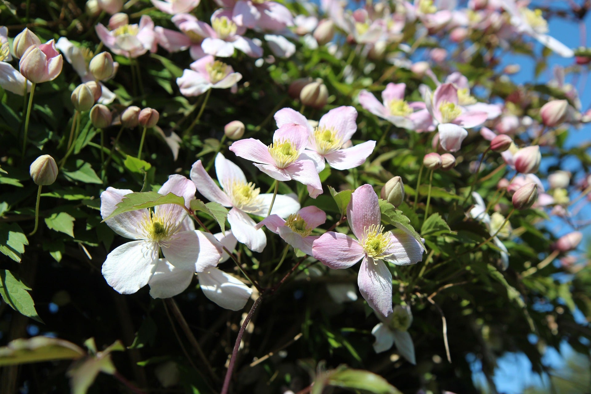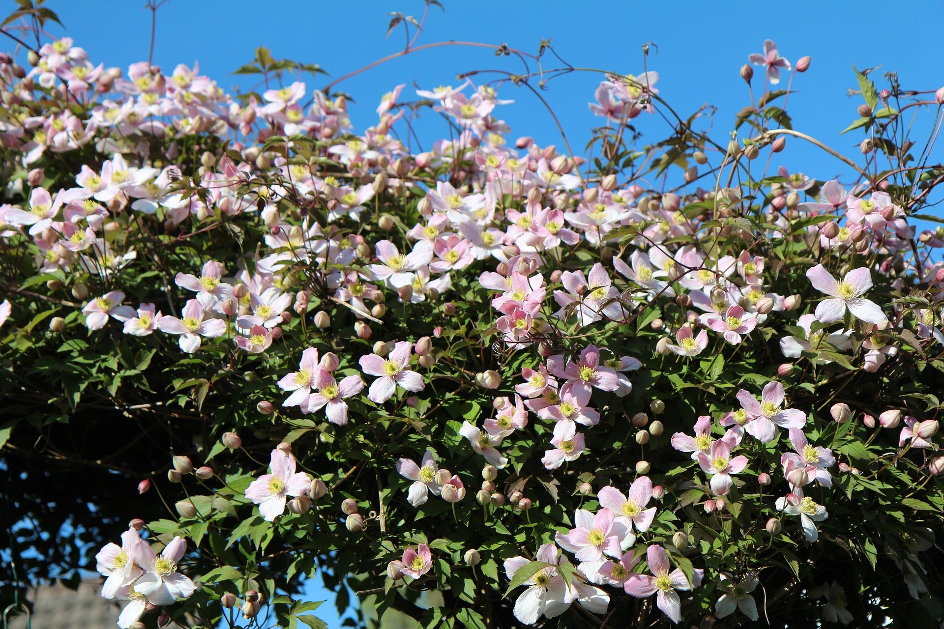 Die Anemonenwaldrebe, auch unter dem Namen Bergwaldrebe bekannt, ist zwar kein einheimischer Strauch, passt aber super in jeden Naturgarten. Die Blüten sind zartrosa, etwa 3-4 cm groß und hängen von etwa Mai bis Juni überreich an dem Gehölz. Sie ist sehr wuchsfreudig und wird etwa 8 Meter hoch, was sie zu einer idealen Rankpflanze für eine Pergola macht, aber auch gerne an einem stabilen Rankgerüst an der Hauswand.