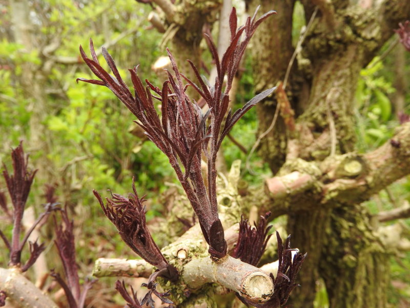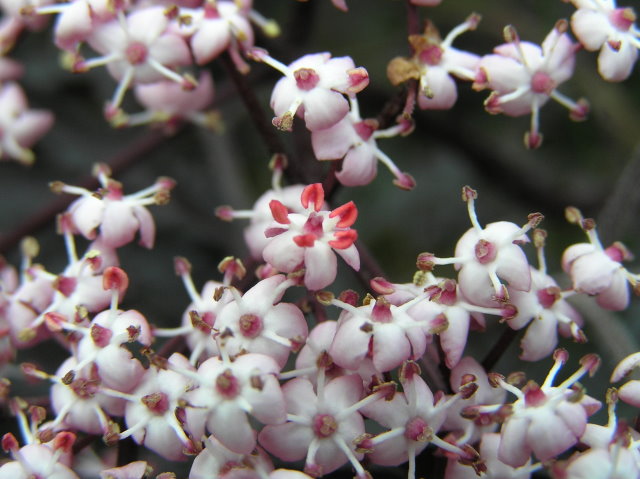 Bei dem sommergrünen Rotblättrigen Schlitz-Holunder handelt es sich um eine neue Sorte. Das Laub des Rotblättrigen Schlitz-Holunders hat eine tiefdunkelrote Färbung. Die gefiederten Blätter selbst sind stark geschlitzt. Nach dem Laubaustrieb bilden sich die 10 bis 20 cm großen doldenartigen Rispen und erblühen im Blütemonat Juni in einem rosa Blütenmeer. Die reifen Früchte des Sambucus nigra Black Lace sind blau bis violett schwarz und genauso vielseitig verwendbar wie die des Schwarzen Holunders, z. B. um Erkältungssymptome zu lindern. Der blutrote Saft ist besonders Farbecht und wurde in der Antike unteranderem zum Haarefärben verwendet.