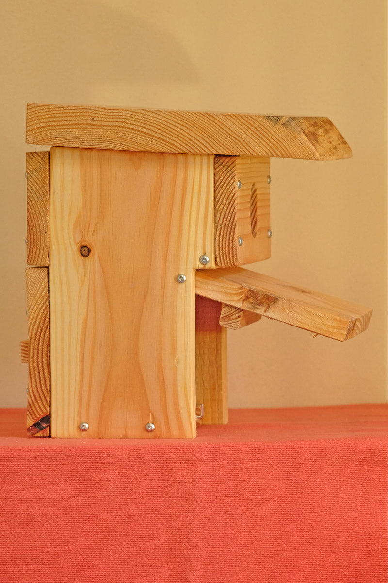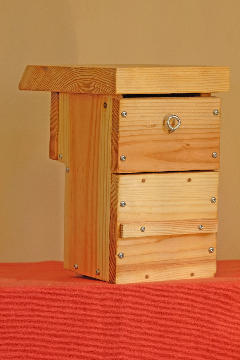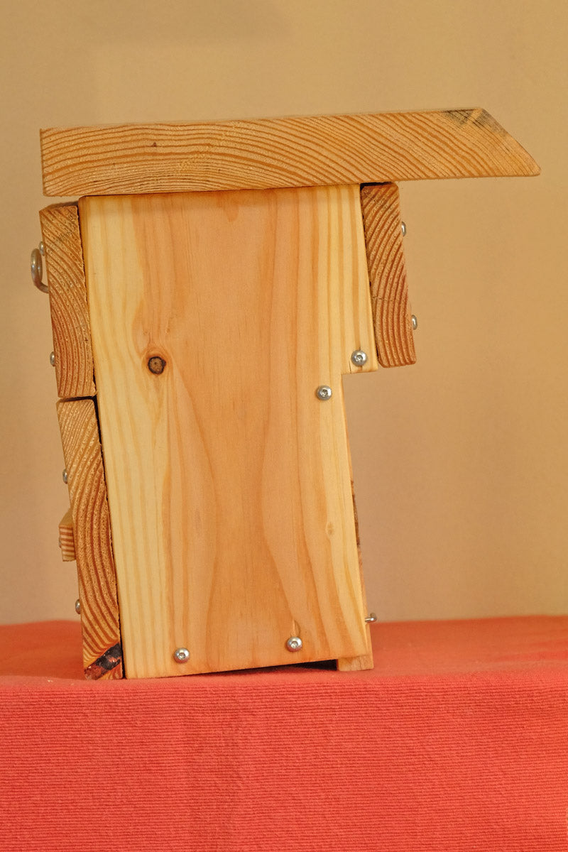 Die Nisthilfe lässt sich unkommpliziert mit einer Ringöse aufhängen. Zusätzlich wurde eine Leiste angebracht, damit der Nistkasten gerade hängt.